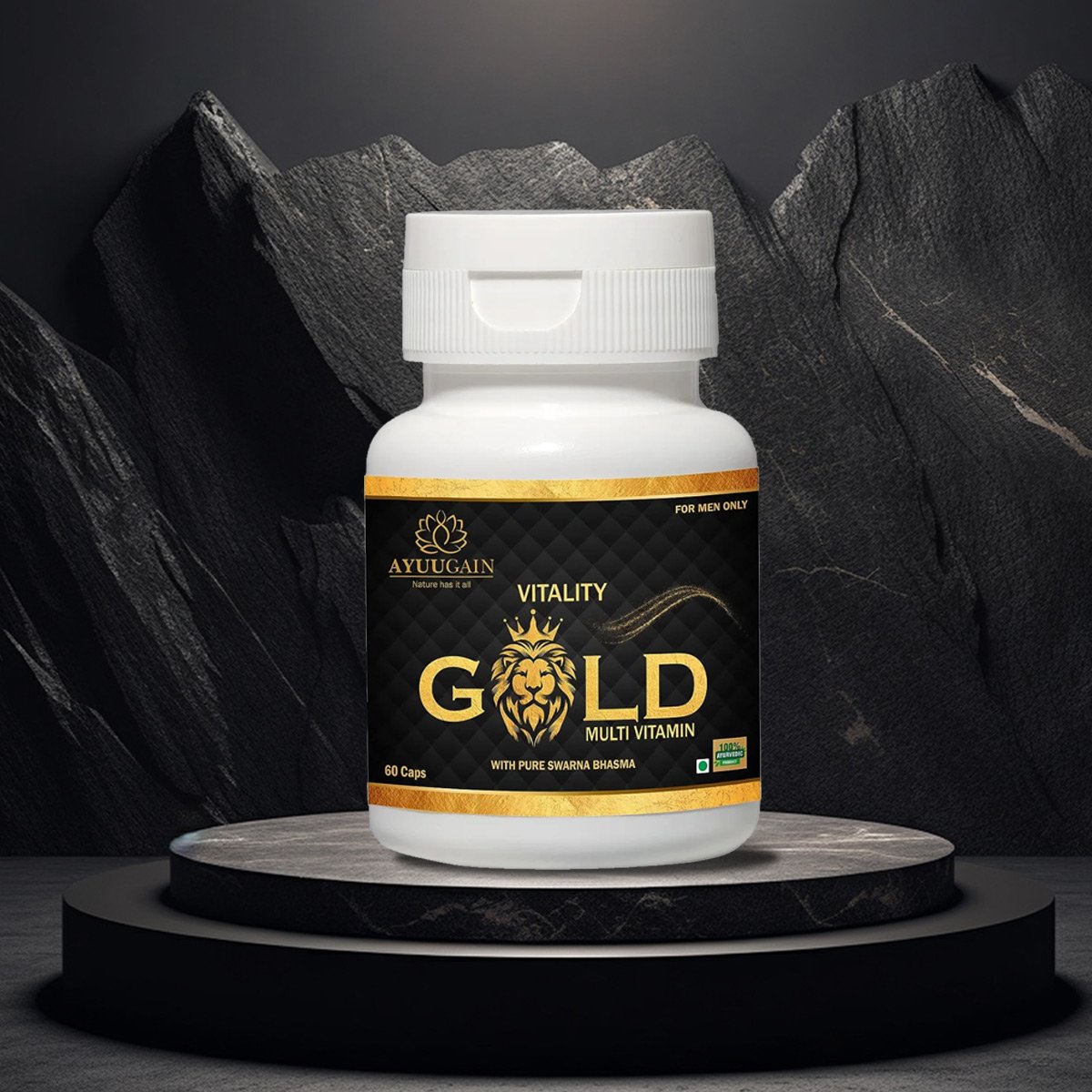 Ayuugain Vitality Gold capsules are a natural Ayurvedic supplement formulated to support men’s vitality, energy, stamina, and overall well-being. They contain a blend of potent herbs, including Shilajit, Safed Musli, Swarna Bhasma, and other carefully selected ingredients.